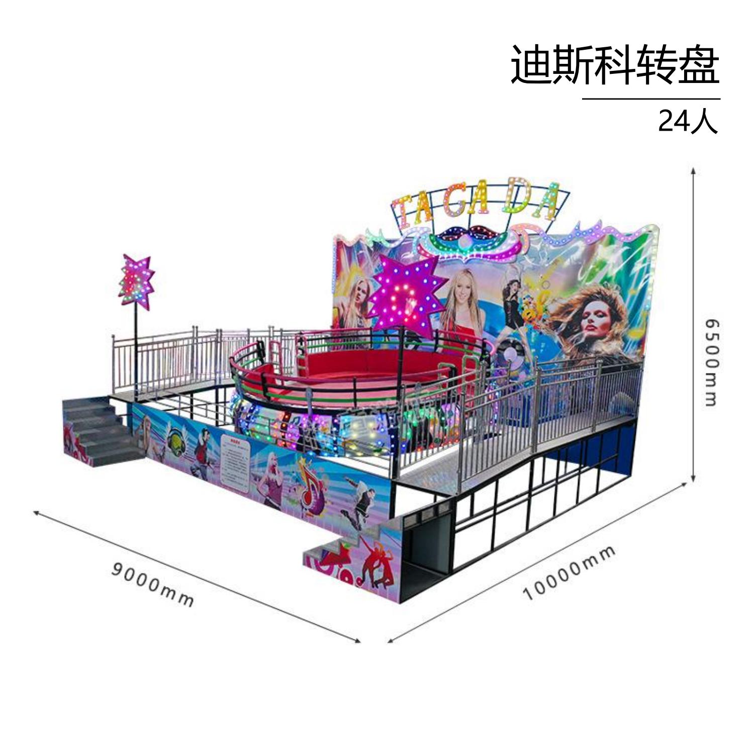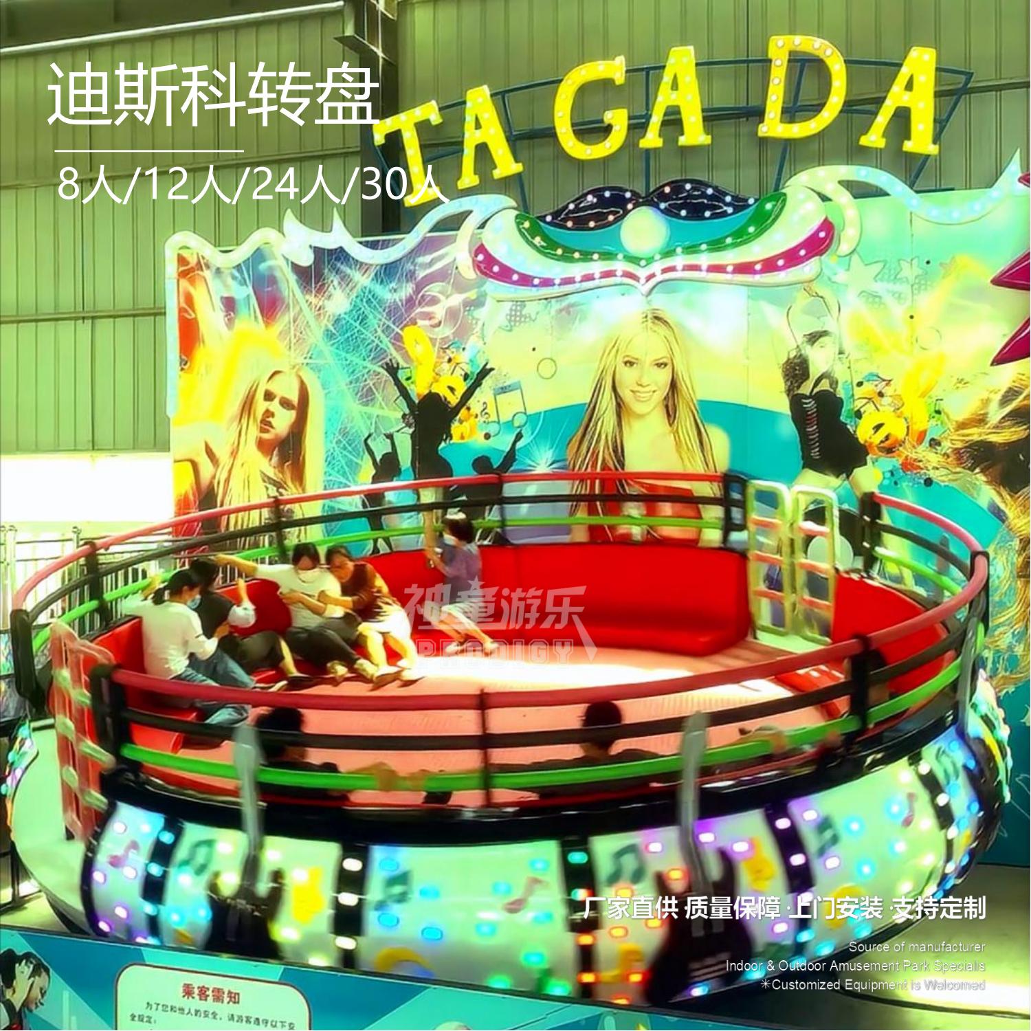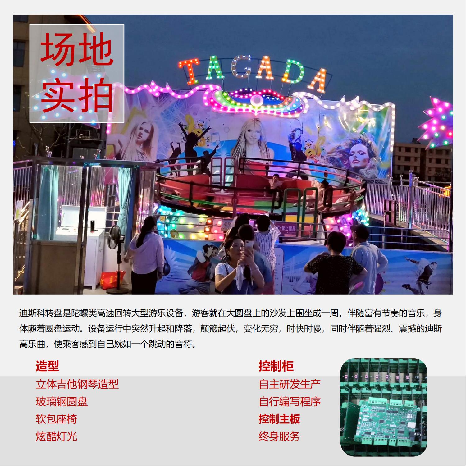 迪斯科轉(zhuǎn)盤是陀螺類高速回轉(zhuǎn)大型游樂設(shè)備,游客就在大圓盤上的沙發(fā)上圍坐成一周,伴隨富有節(jié)奏的音樂,身體隨著圓盤運(yùn)動(dòng)。設(shè)備運(yùn)行中突然升起和降落,顛筋起伏,變化無窮,時(shí)快時(shí)慢,同時(shí)伴隨著強(qiáng)烈、震撼的迪斯高樂曲,使乘客感到自己婉如一個(gè)跳動(dòng)的音符。