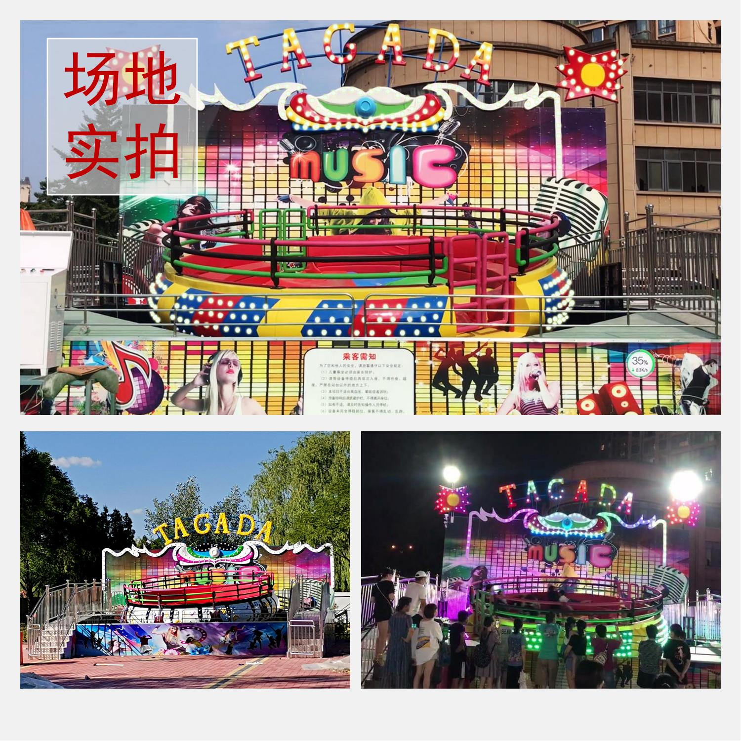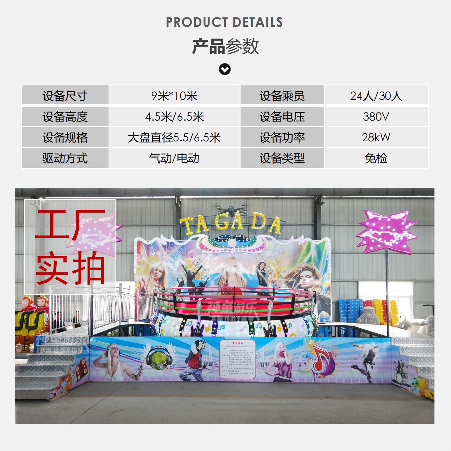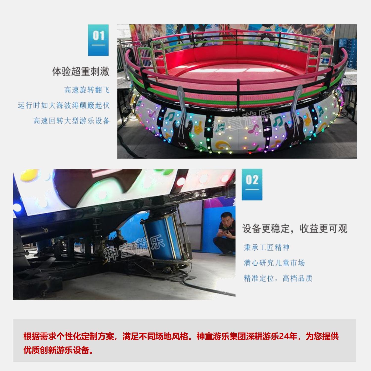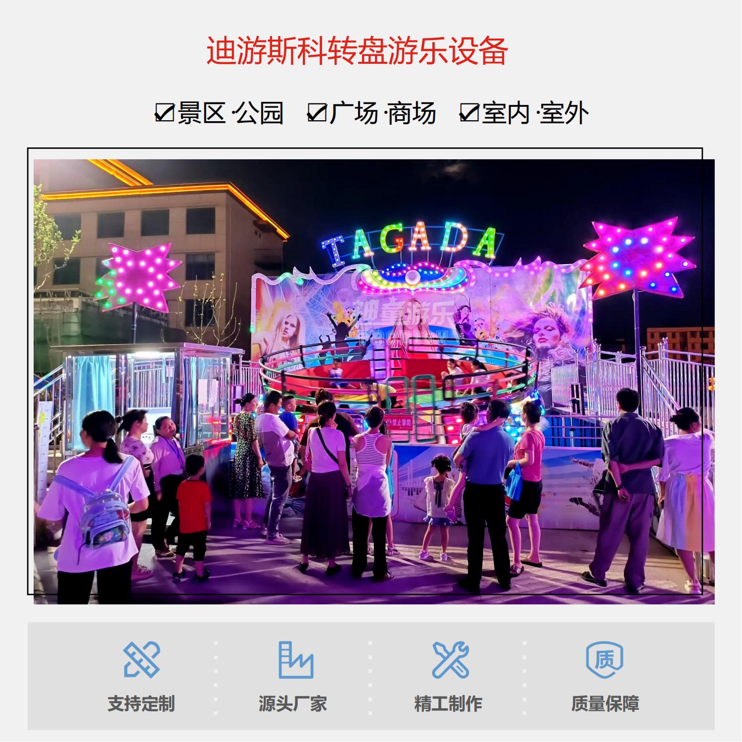 迪斯科轉(zhuǎn)盤是陀螺類高速回轉(zhuǎn)大型游樂設(shè)備,游客就在大圓盤上的沙發(fā)上圍坐成一周,伴隨富有節(jié)奏的音樂,身體隨著圓盤運(yùn)動(dòng)。設(shè)備運(yùn)行中突然升起和降落,顛筋起伏,變化無窮,時(shí)快時(shí)慢,同時(shí)伴隨著強(qiáng)烈、震撼的迪斯高樂曲,使乘客感到自己婉如一個(gè)跳動(dòng)的音符。